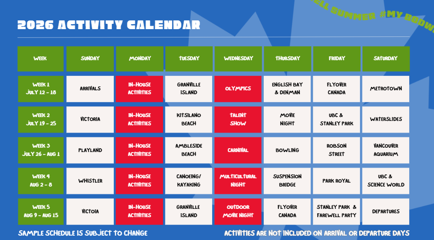 2026年度のボドウェル・ハイスクールのサマーキャンプの日程と費用です。より詳細の資料・情報をご提供しております。どうぞ気軽にマイルストーンカナダまでご連絡下さい。