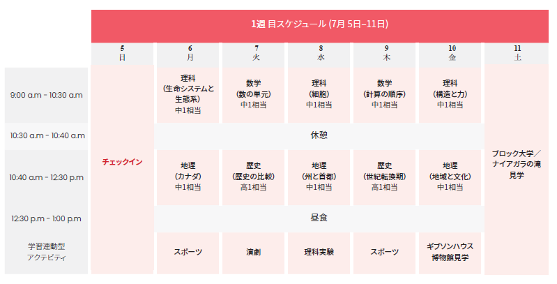 | 課外活動 | CNタワー/ナイアガラの滝/ハイキング/BBQ/スポーツ観戦/トロント動物園/カナダズワンダーランド/ミュージアム/カヌーなどのアクティビティ/市内探索など |